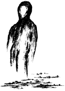來到禪寺門口,旁邊都是樹林,在夜裡接近這種「陰界邪靈的大本營」,特別感覺陰風陣陣的詭異。我和鍾馗靜靜地等著……過一會兒,從禪寺裡飄出一團黑霧的人形—就跟我十六歲碰到的無臉鬼一樣!(如圖示)祂的臉孔看不見五官,只有兩顆發著綠光的眼睛,看起來特別恐怖!