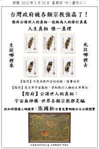 此書大手筆地採用彩色印刷,同樣大量寄贈全臺各界人士、單位。書冊散播出去,開始有智慧者出現,不多;但也有少數的道法人寄來符咒(「收伏張國松」的字眼快讓我們笑死)、畫滿符令的金紙和五彩紙插在我門口的花盆、草人插針收集到一隻、插著令旗的豬頭撿到一顆,上面還寫著:「急急如律令、張國松納命來」,此外,還有人特地天天騎車到我住處巡一下,看我有沒有如他們大師所下的咒法死掉,連看了四十九天,連機車聲我都認得了……