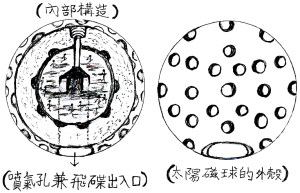 ■這是「太陽外殼與內部構造」的大概圖示:此外殼佈滿氣孔,為吸收二氧化碳及排放磁流能量(太陽能)的通道口—就是靠著太陽外殼旋轉的運作,在吸收天下民間所排放的「二氧化碳」進入太陽內部第二層提煉處。