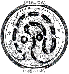 ◎此圖示:太陽出口處和入口處周圍的冰山雪地區域,為太陽的「保養、維修」之處。約半年的時期,太陽會在每日運行時,帶出沼泥界的廢棄物,於是此顆需整修清理的太陽,會在『太陽出口處』排放黑霧色的廢氣體,掩蓋住太陽的光芒;再加上『黑雲板塊』的挪移,遮住日月界的光與熱(當地必為冬季),形成『太陽出口處』附近的寒冷地帶,會有「永夜」的情形。