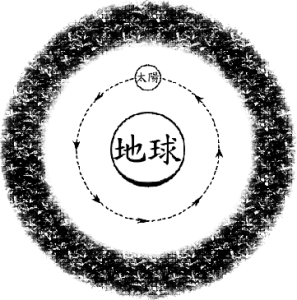 圖示(一):這是原始【盤古宇宙】的面目;在圖內中間的圓周「地球」—這是原始「萬物生類者的修行處」;這也是原始盤古宇宙的「太陽時代」之處境。(確實民間歷史至今仍不知宇宙最初有「太陽時代」之事。)