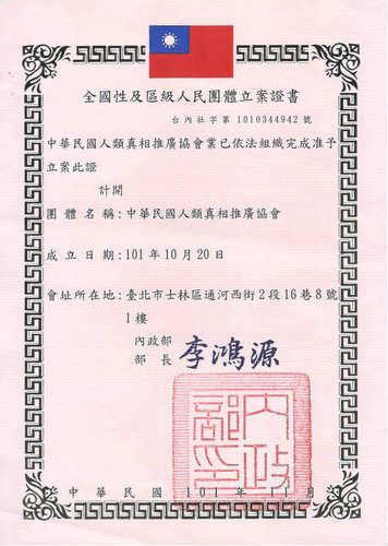- 民國 101 年 10 月 20 日內政部核准設立,內政部立案登記證號:1010344942。